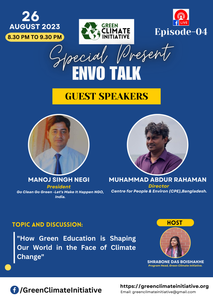 Envo-Talk Special Live Program: Episode 4 – How Green Education is Shaping Our World in the Face of Climate Change Date: August 26, 2023 Time: 8.30 PM-9.30 PM (GMT) Platform: Green Climate Initiative’s Official Facebook Page. Host: Shrabone Das Boishakhe, Program Head of Green Climate Initiative Guest Speakers: Manoj Singh Negi, President of “Go Clean […]
